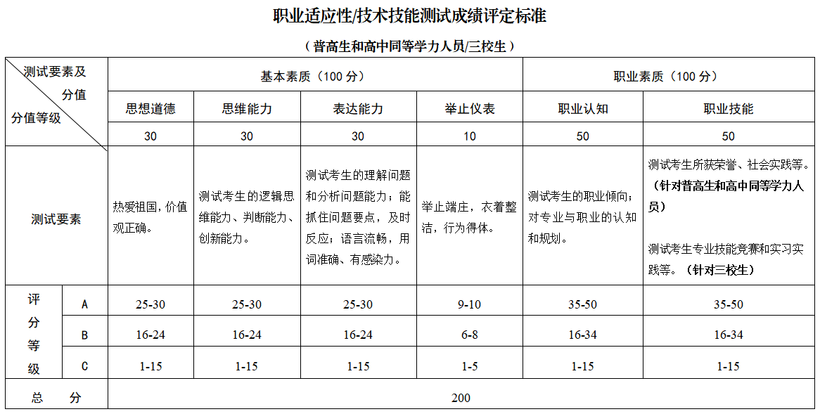 普高生和高中同等學力人員測試職業適應性,總分為200分,其中基本素質占100分,職業素質占100分,采用面試形式,測試時間為10分鐘以內(包括準備時間)。